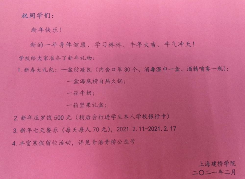 在医学院校,留校学子多利用寒假入院实习。上海健康医学院后勤服务中心主任、校防控办副主任张美蓉告诉记者,目前留校学生900多人,老家属于中高风险地区的学生仅3人,其实大部分都是正在各大医院实习的“候鸟学生”,“这部分学生几乎只在学校住宿,出入流动性强,也给校园防疫加大了难度,提高了要求。”为此,每天全校保证200多名教职工为学生服务,还与邻近的周浦医院结对,保证应急防疫等。