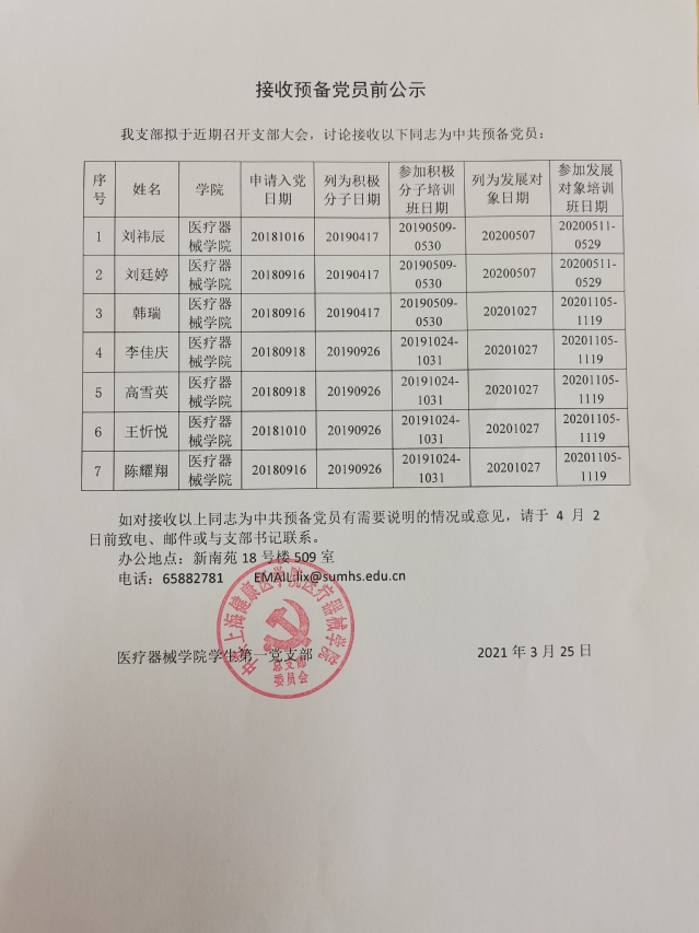 医疗器械学院学生第一党支部接收预备党员前公示