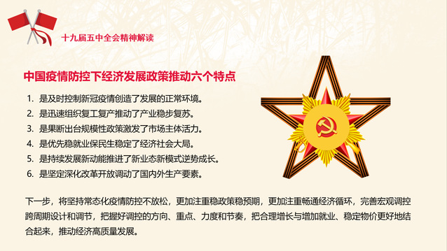 习近平总书记在会议中提出构建以国内大循环为主体、国内国际双循环相促进的新发展格局,是我们党对经济发展客观规律的正确把握和实践运用。五中全会中明确提出到2035年建成文化强国,对文化建设部署了三个方面的重点任务:一是提高社会文明程度;二是提升公共文化服务水平;三是健全现代文化产业体系。同时将“十四五”时期经济社会发展的关键目标概括为“六个新”:经济发展取得新成效、改革开放迈出新步伐、社会文明程度得到新提高、生态文明建设实现新进步、民生福祉达到新水平、国家治理效能得到新提升。面对蔓延至全球的新冠疫情,党的十九届五中全会提出了中国疫情防控下经济发展政策推动六个特点:及时控制新冠疫情创造了发展的正常环境;是迅速组织复工复产推动了产业稳步复苏;果断出台规模性政策激发了市场主体活力;优先稳就业保民生稳定了经济社会大局;持续发展新动能推进了新业态新模式逆势成长;坚定深化改革开放调动了国内外生产要素。
