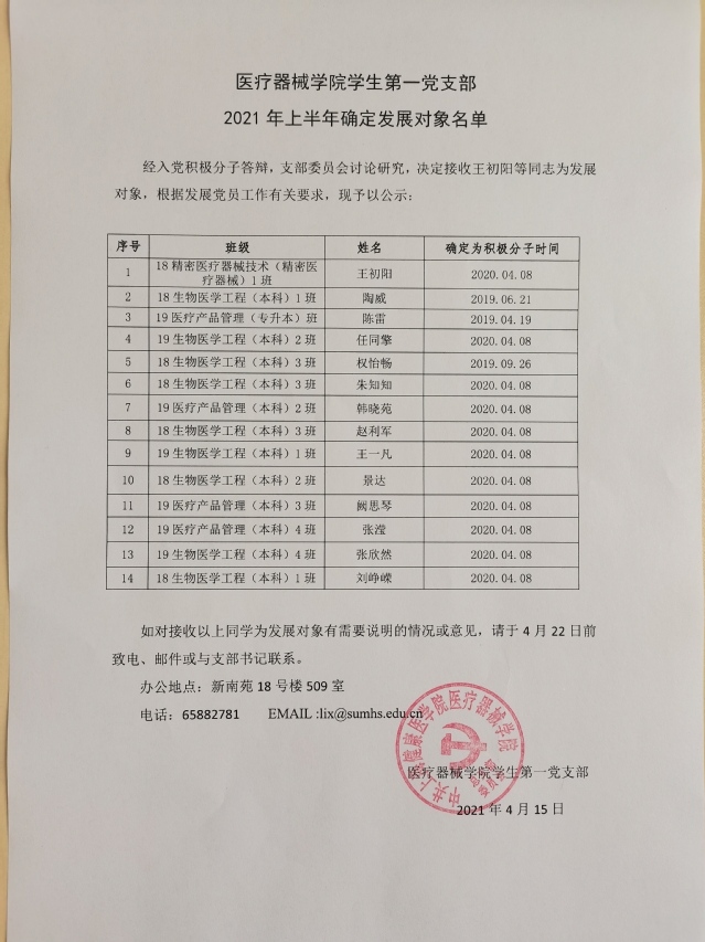 医疗器械学院学生第一党支部2021年上半年确定发展对象名单公示