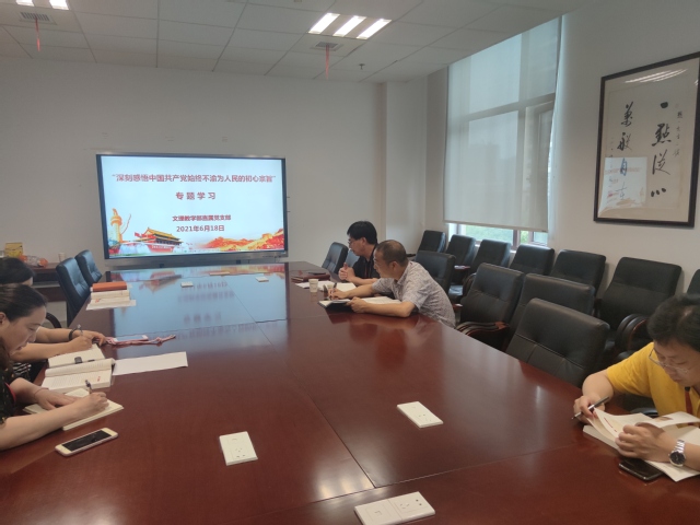 6月18日,文理教学部党政理论学习小组在南苑2号楼302会议室围绕“深刻感悟中国共产党始终不渝为人民的初心宗旨” 组织专题学习,学习会由书记秦禹权主持。