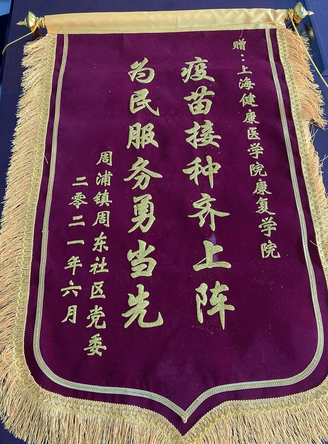 6月29日上午,周东社区党委书记张竹英一行将一面绣着“疫苗接种齐上阵 为民服务勇当先”的锦旗送到康复学院,感谢学院在周东社区的疫苗接种过程中给予的支持和帮助。