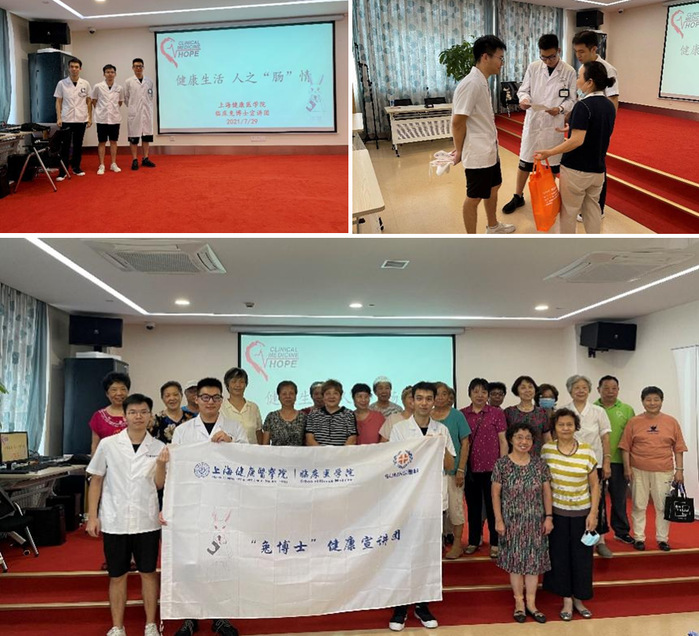 2021年暑期,正值党史学习教育期间,临床医学院团总支积极组织青年学生,结合专业知识,深入基层,开展健康宣讲活动。临床兔博士宣讲团开辟新章,以“人之‘肠’情,呵护肠道健康”为宣讲主题,沪川携手,为两地的居民带来一次酣“肠”淋漓的健康宣讲,向基层百姓普及大肠癌预防知识及其开展早期筛查的重要性,为“健康上海”“健康中国”贡献青春力量。