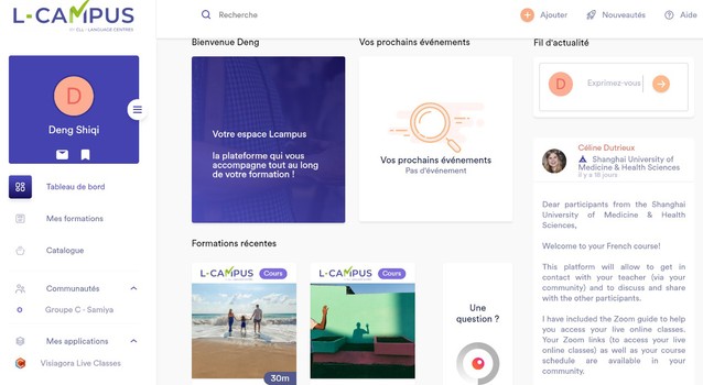 虽然师生相隔万里,但是Zoom视频会议、L-CAMPUS网站等拉近彼此距离,老师们课件讲授之余,辅以实时纠音、课后笔记分享、线上小组讨论、线下总结等多种形式,有效地提高了同学们的法语水平,实现了教材同步、小组讨论、作业上传一站式学习模式。