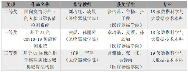 在备战国赛的过程中,3支参赛队伍在教务处、信息管理中心和医疗器械学院等各部门的大力关心和支持下,在各位指导老师的悉心指导和耐心带教下,参赛选手们加倍努力,反复练习,精心打磨。2021年5月提交国赛资料,历经资料填报、作品设计、作品提交、线上答辩等环节,经过激烈的比拼,最终我校学生在国赛中取得了二等奖1项,三等奖2项的优异成绩。
