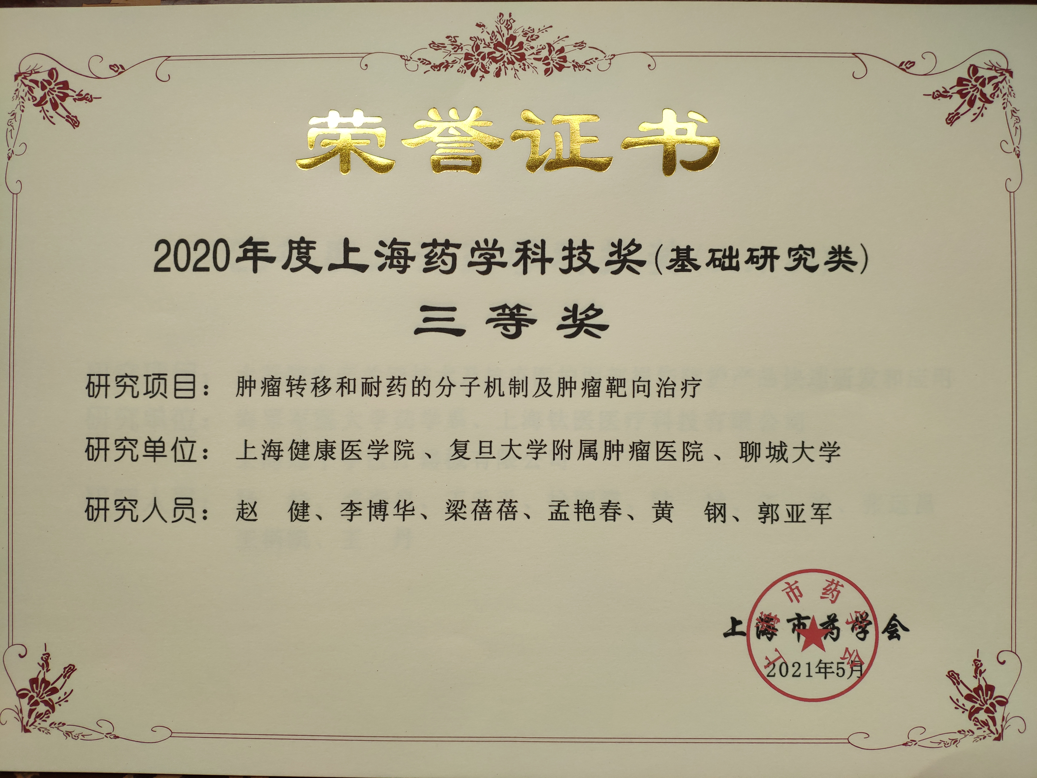 我校分子影像重点实验室赵健教授领衔申报的科研成果《肿瘤转移和耐药的分子机制及肿瘤靶向治疗》荣获上海药学科技奖三等奖。“上海药学科技奖”由上海市药学会主办,旨在奖励在药学科学技术领域中做出突出贡献的广大药学科学技术工作者的积极性和创造性,促进本市药学科学技术事业的发展。