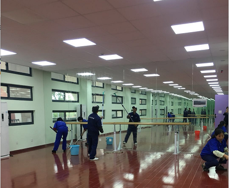 为不影响学生如期搞活动,物业保洁、维修人员齐上阵,紧张有序地对新南苑3#楼进行楼宇开荒保洁、设施检查维修工作。