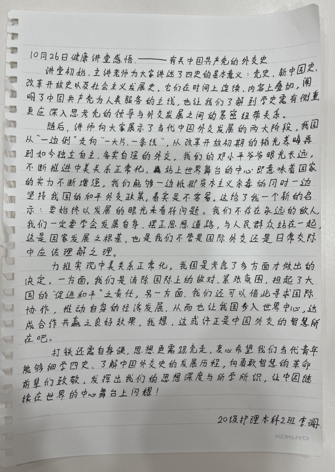 活动中,薛老师以幽默风趣的语言风格为同学讲解中国这一阶段的外交行为,让同学们在欢笑中对这段历史留下深刻印象同时引发学生们的思考。自己作为新时代公民,我们更要响应国家号召,以创新的思路攻坚克难,保持锐意进取的精神风貌,不同时期,要对自己有不同的要求,要永远走在学习的路上,不断提高自己,完善自己,让自己更符合党和人民的需要。向书本学习,新理念、新技术层出不穷,我们要广泛涉猎,拓宽自己的知识面;向人民群众学习,在日常学习中常怀敬畏之心,既要学习他人的闪光点也要学习好的品格;向专家学者学习,以过硬的技术及理论知识武装自己,善于打破陈规陋习,努力增强适应新时代要求的本领和能力。