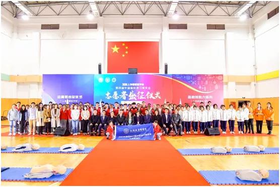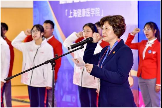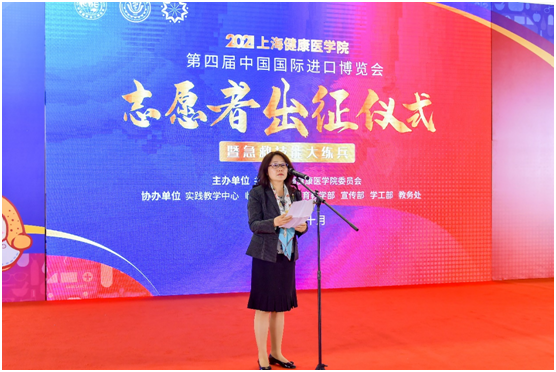 上海健康医学院党委副书记、副校长唐红梅带领全体进博会志愿者庄严宣誓:“‘健康小叶子’将继续以志愿精神与医学提倡的‘责任、奉献、协作、人道主义’职业精神结合,为进博贡献自己的青春!践行青年一代‘请党放心强国有我’的誓言。”