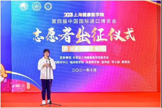 校医学技术学院19级学生陈子玥作为本届进博会志愿者代表发言,她表示,所有“健康小叶子”已整装待发,将不负学校所托,向社会展现健康学子的使命担当,向党和国家展现健康学子的坚定决心,向世界展现健康学子的志愿风采。