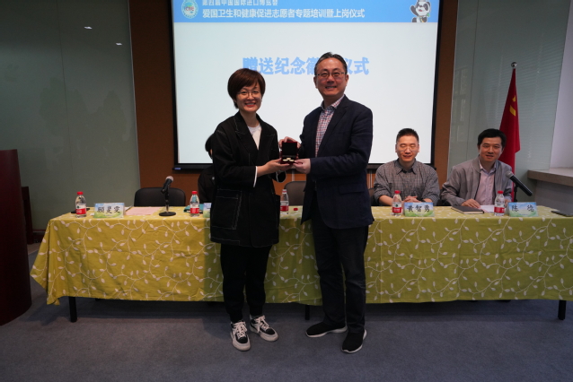 王彤接受由上海健康医学院赠送的进博会志愿者纪念徽章。