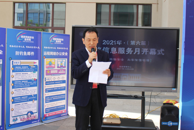 李兆伟在主持中介绍了本届网络信息服务月的主题和背景。信息管理中心副主任王云光介绍了此次服务月的主要内容。开幕式之后,面向全校师生将陆续开展网络安全和信息服务宣讲,网络安全培训、讲座和演练,校园网IT相关技术支持上门服务,各项服务、推广和宣传活动。还将采用面对面交流、网络问卷调查等方式,深入调研师生需求。