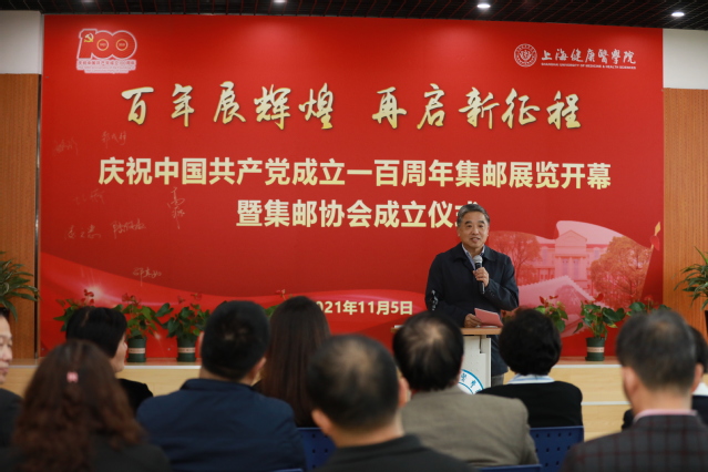 陶文捷致贺辞,他代表上海市教育工会对学校集邮协会的成立表示祝贺,并希望学校将集邮协会打造成学习、教育和团结鼓劲的平台,通过开展丰富多彩的集邮活动,以邮会友增交流,共同为教育事业培养更优秀的人才,为健康医学院高质量发展做出新的贡献。