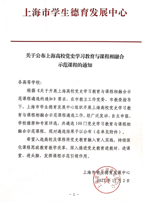 近日,上海市学生德育发展中心公布了上海市高校党史学习教育与课程相融合示范课程的名单,我校申报的2门课程(《预防医学》《女性健康》)全部入选。