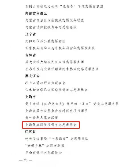 志愿服务一直以来是上海健康医学院师生担当社会责任,践行校训精神,体现育人成果的优良传统。在第36个国际志愿者日来临之际,由共青团中央、中国青年志愿者协会发起的第十三届中国青年志愿者优秀个人奖、优秀组织奖、优秀项目奖评选结果隆重揭晓,上海健康医学院青年志愿者协会荣获第十三届中国青年志愿者优秀组织奖,该奖项作为中国青年志愿者工作最高荣誉全国共计100个组织获奖,上海仅4个,对于全校师生志愿者是最高的褒奖,最美的节日礼物。