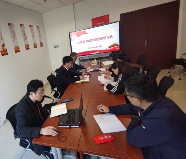4月13日中午,文理教学部直属党支部在南苑2号楼306会议室组织召开党政理论学习会,专题学习习近平总书记在党史学习教育动员大会上的讲话,教学部党政领导班子、支委会成员、党建员参加了会议,巡察员解晓峰列席了会议。会议由书记秦禹权主持。