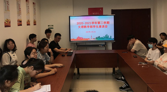 6月3日中午,文理教学部在南苑2号楼306召开党史学习教育之“与学生面对面”座谈会,虚心听取广大同学对文理教学部教师教育教学过程中的意见和建议。会议由直属党支部书记秦禹权主持,教学部主任耿铭、副主任侯丽英、教学秘书焦建利、人文教研室主任陆理原、数学教研室主任闵建中和各学院的学生代表参加了座谈会。