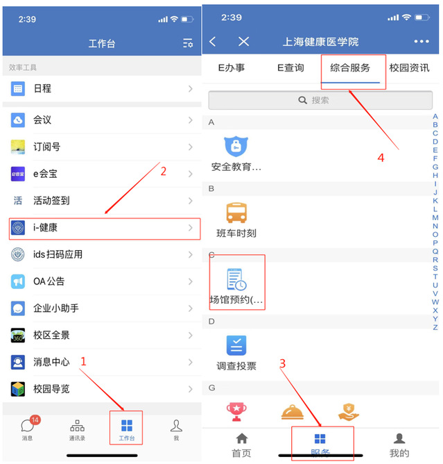 企业微信:工作台—> “i-健康”—> 服务—>综合服务—>场馆预约,如图: