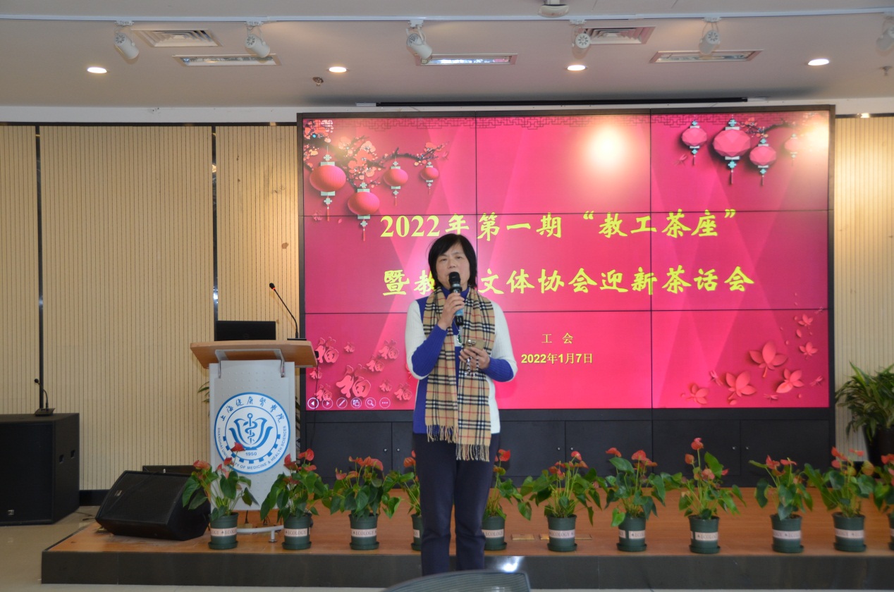 2022年第一期“教工茶座”暨教工文体协会迎新茶话会在南苑7号楼403多功能召开。校党委副书记、工会主席于莹,工会常务副主席凌文惠,副主席芦静、郁建新,各教工文体协会负责人、积极分子40余人参加会议。会议由工会兼职副主席、校工会文体委员郁建新主持。