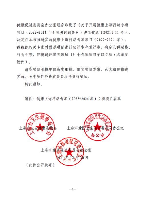 近日,健康上海行动专项(2022-2024年)评审结果公布,由我校吴韬校长领衔,联合上海市老龄事业发展促进中心、上海市第一人民医院和上海市第十人民医院等多家参与单位共同申报的“打造老年照护健康链,推进主动健康服务体系建设”获批立项。本次参评共计100家单位,222个项目,最终在人群赋能、行为干预、环境建设三个领域的19个专项项目予以立项。