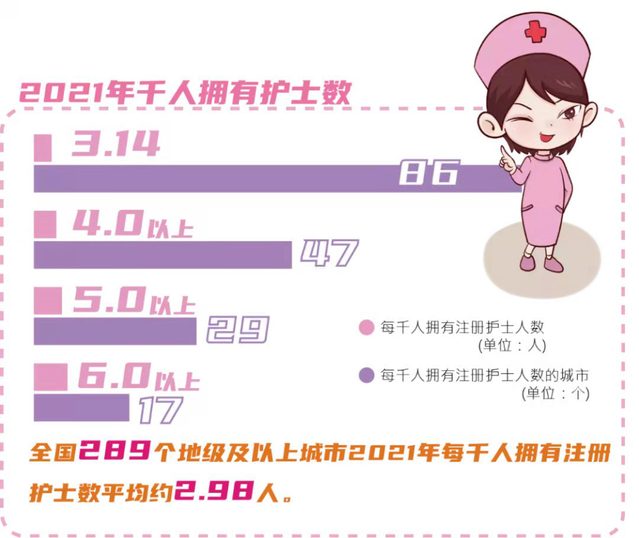 千人拥有注册护士数达到《“十三五”全国卫生计生人才发展规划》的3.14人目标的城市有87个,比2020年增加了7个;每千人拥有注册护士数达到4人及以上的城市有46个,较2020年增加了4个;每千人拥有注册护士数达到5人及以上的城市有29个,较2020年增加了3个;每千人拥有注册护士数达到6人及以上的城市有17个,较2019年增加了2个。2021年,全国289个地级及以上城市每千人拥有注册护士数平均约2.98人,较2020年增加了0.19人,高于世卫组织提出的每千人口应有2名护士的标准。虽然这一数据还未达到《“十三五”全国卫生计生人才发展规划》目标,但进步较快,医护比倒置的局面逐年有较大改观。