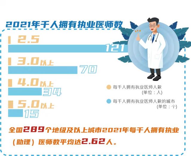 2021版蓝皮书显示,每千人拥有执业医师数达到《“十三五”全国卫生计生人才发展规划》的2.5人目标的城市有121个,比2020年增加了73个;每千人拥有执业医师数达到3人及以上的城市有70个,较2020年增加了34个;每千人拥有执业医师数达到4人及以上的城市有34个,较2020年增加了12个;每千人拥有执业医师数达到5人及以上的城市有15个,较2020年增加了4个;全国289个地级及以上城市2021年每千人拥有执业(助理)医师数平均达到2.62人,较2020年增加了1.09人,超过了《“十三五”全国卫生计生人才发展规划》的2.5人目标。
