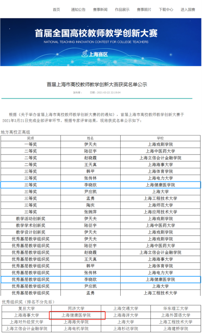 近日,由上海市教育委员会指导,上海市高等教育学会主办,上海交通大学牵头承办的首届上海市高校教师教学创新大赛落下帷幕,经过近五个月共三轮比拼,我校医疗器械学院李晓欧教授团队喜获地方高校正高组三等奖及优秀基层教学组织奖,临床医学院蔡巧玲院长团队获得地方高校副高组优秀奖,基础医学院吕叶辉老师团队获得地方高校中级组优秀奖,学校获得优秀组织奖。