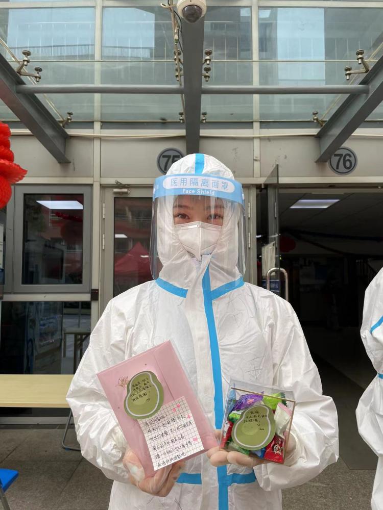 “孩子们也很体谅我和楼管阿姨的工作,无论是早上6:00分发早饭,还是晚上10:00清点人数,都会关心我们的安全和健康,还有几位小可爱们把自己之前囤的美食分享给我们。楼里的几位学生党员和预备党员也起到模范带头作用,在没有过多的防护服下,依然能挺身而出帮助老师们完成楼里的日常工作,真的特别感谢这些志愿者们。”