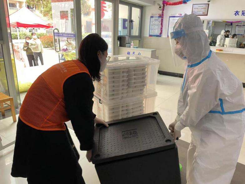 楼宇志愿者帮助分发餐食