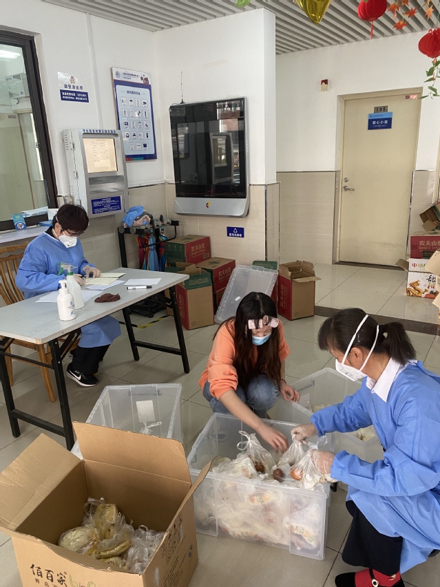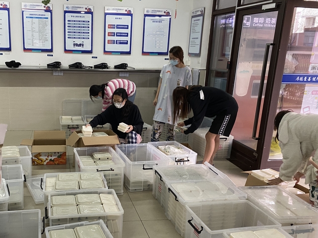 为保证每位同学都能吃上热饭热菜,学校组织后勤统一免费配送餐食,文娟老师与宿管阿姨、楼长王舒心同学以及各位楼层长一起对每层的饭菜进行分配,最后由层长送到寝室长的手上,确保每位同学能够准时准点吃到可口的饭菜。主动解决学生需求,确保学生的需求得到反馈,并加以解决。在此期间,同学们提出了想要早餐多样化,吃到当季的水果,需要在每个楼层都有直接饮水,缺乏防疫物资等一系列的需求,经过南苑区综合办上报,都得以解决。