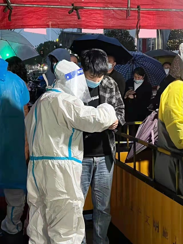 3月20日,在浦东新区新场镇新环广场核酸检测点,身穿大白的曾冬冬老师站在入口处,招呼居民有序检测核酸。她的工作任务是与其他志愿者们一起,维持核酸检测大棚入口秩序,提示居民准备好核酸检测预约码,同时用自己的手机帮助没有预约码的老人预约核酸检测,再请排在队伍里的愿意帮忙的年轻人帮忙拍预约码的照片顺便带老人过去检测核酸。从早上6:50开始一直到晚上最后一个居民结束核酸检测,除了吃午饭和上厕所,她一直坚守在岗位上。“非常累,非常冷,袜子又全湿了,腰酸死了,嗓子有点疼”,这是她最真实的感受;“大家不要着急,核酸检测很快的,预约码准备好,下雨天有点滑,注意安全”,这是她重复最多的一句话;“这是我声音最温柔的一天,我服务了很多熟悉的邻居”,她自豪地跟人讲:“一天,粗算下来近万人走进了这个核酸检测大棚,没有发生混乱,不容易的!”