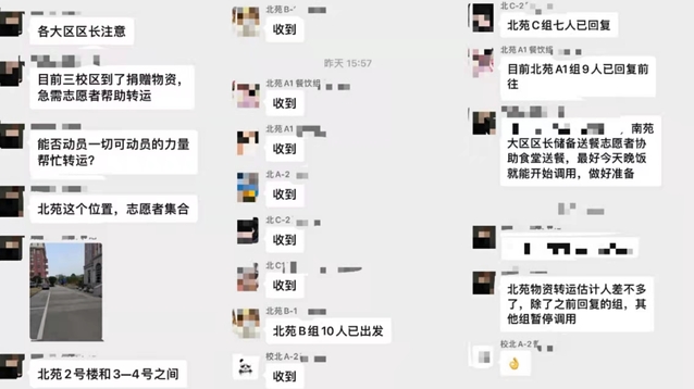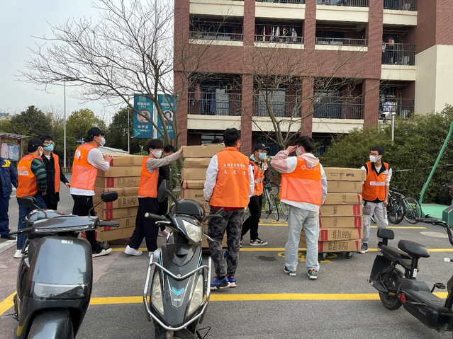 当学校的防疫物资到货后,经常遇到急需人手前去各校区门口转运。带队老师在群里发布了急缺人手的消息后,3个校区各大区负责人迅速集结起机动组“小橘子”们,第一时间发动起了一切可发动的力量,火速赶往各个转运点。很多临时接到任务的“健康小橘子”甚至来不及换上小马甲,从食堂、宿舍迅速赶往现场投入到物资转运的队伍中。