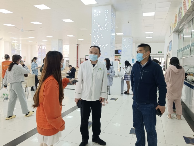 当细心的“小橘子”发现北苑食堂打饭菜的窗口和打包的区域靠得很近,容易造成食堂内人员流动性减缓。第一时间找到了食堂经理和学校后勤服务中心的老师,进行了一次“实地考察”,并提出了合理的建议。老师们和“小橘子”以最快的速度制定了解决的方案:在食堂各窗口相应的地方增设了一米间隔线,将自选菜肴的窗口进行了分散,给需要打包的同学们留出了足够安全的空间。同学们见到地上新增的标识后,也变得非常配合,自觉间隔一米排队。“小橘子”们用自己真挚的服务,在同学们心里也画下了一道防疫安全线!