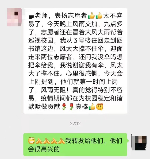 第一轮核酸检测将近中午时分,气温越来越高,太阳也火辣起来。等待检测的队伍还在向前缓慢推进,或许是没有吃午饭加上天气的炎热,有一位女生在待检区附近出现中暑症状。南苑核酸组组长樊祎哲,和南苑志愿者总负责人韦亚宁、戴冰钰接到突发情况后,第一时间报告老师,和带队老师一同赶到现场处置。叮嘱同学在阴凉处先好好休息,同时安抚同学情绪。待同学情况有所好转,为她尽快安排了核酸检测,以便同学早点回去休息。