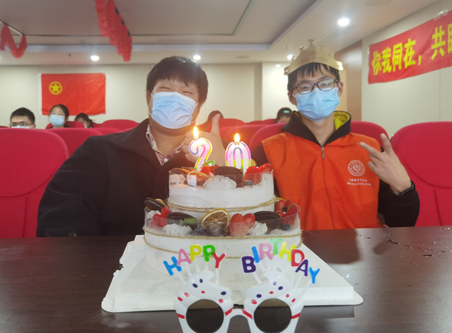 “祝你生日快乐!”3月19日18:30,在浦东新区疾控中心14楼会议室和上海健康医学院新南苑4号楼会议室里,同时响起了温暖的《生日快乐歌》。点亮“20”字样的蜡烛、切开冰淇淋蛋糕和老师同学分享、收获2021级学弟学妹手绘版的生日祝福,上海健康医学院大二学生熊自强和沈允普,在学校师生志愿团队的祝福里,度过了难忘的20岁生日。