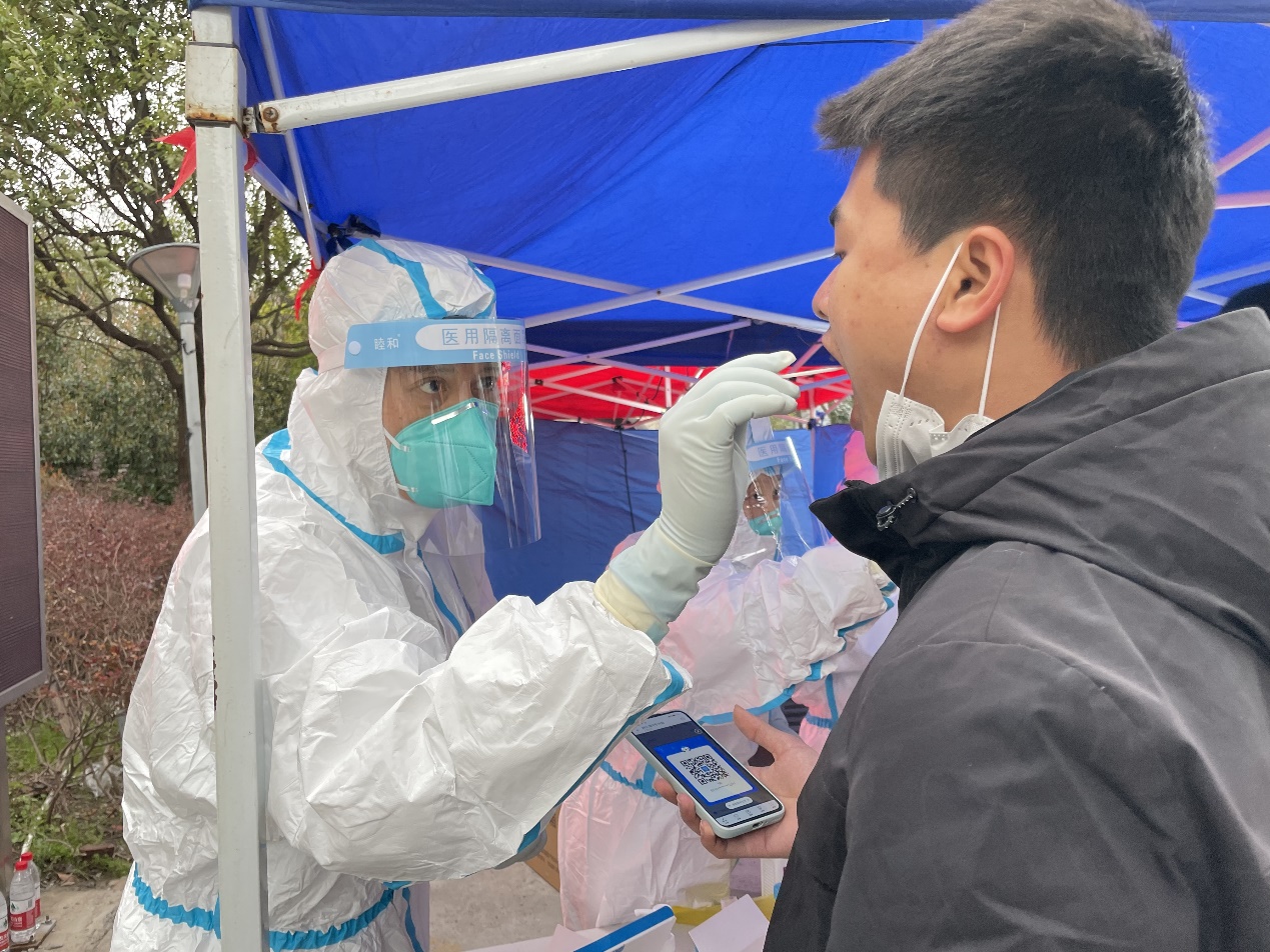 马晓昀是九三学社上海健康医学院支社的主委,也是一名主任医师。疫情当前,他毅然奔赴前线,化身大白,到小区参加核酸采样任务。
