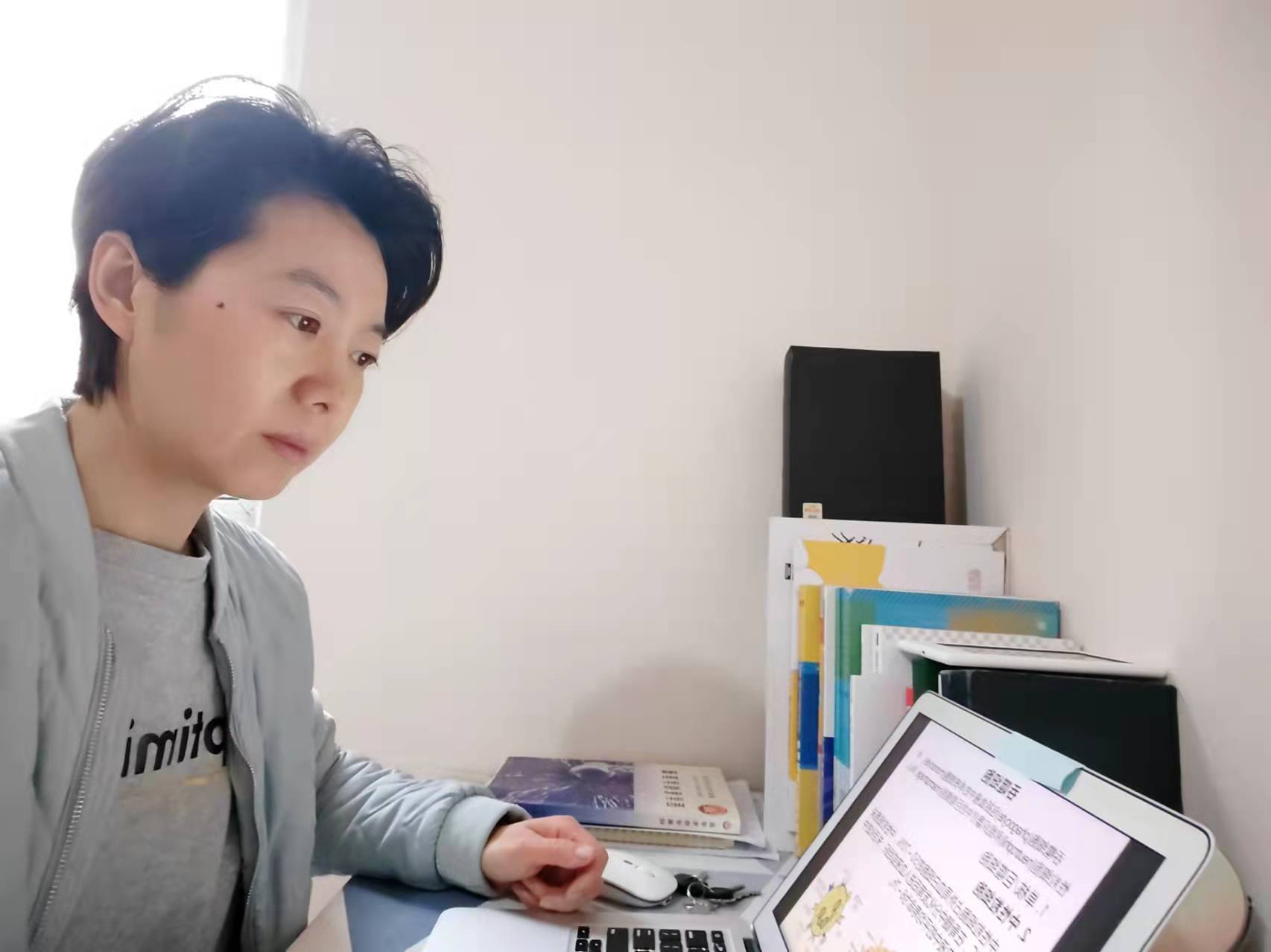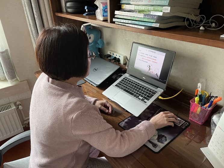 医学影像学院孙九爱老师在给医学影像技术专业的学生上专业英语课。因为无法和学生面对面,为提高学生积极性,孙九爱老师增添了一些幽默桥段,课堂趣味横生,牢牢吸引了学生们的注意力。
