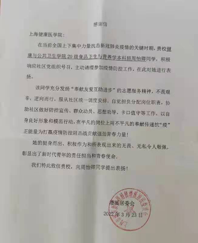 3月20日,周怡卿同学穿上防护服,加入了小区大白队伍,当天下着淅淅沥沥小雨,气温骤降,她身披雨衣挨家挨户上门核对居住人口信息,帮助不会操作的老人完成健康云登记,随后组织大家前往核酸检测点。她说:“相比于晴天,下雨天组织社区居民去做核酸检测更需要做好动员、思想劝导工作。”当她看到一位妈妈抱着2岁的小宝宝在雨中排队等着核酸检测时,她果断地上前与其他排队的人耐心沟通,让这位小宝宝提前完成核酸检测。在服务期间,她服从社区统一调度安排,自觉担负分配岗位职责,协助社区做好防控宣传、动员群众、思想劝导、卡口值守等工作,以自身良好的形象和模范行动,以及挺身而出、积极作为,彰显新时代青年的责任担当和青春使命,得到周浦镇澧溪居委会的肯定,特地写来感谢信,赞扬她的主动请缨、无畏逆行的无私行为。