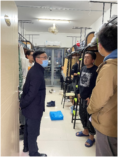 近日,在贺民副书记带领下,学院值守人员多次深入宿舍,关心看望学院留校同学,并与大家亲切交谈。走访中,贺民向同学们转达了学校、学院对他们的关心,介绍了学校现阶段疫情防控工作要求,了解了同学们在线学习情况以及宿舍卫生、消毒和通风情况。感谢同学们对学校防控工作的充分理解和全力配合,提醒同学们要提高防范意识,注重保持健康的生活方式,保持积极乐观的心态面对疫情下的学习、生活、就业。同学们不管在学习、生活上有什么困难或不能满足需求的地方,请同学们一定及时联系学院,提出意见建议,学院定将尽快协调解决,确保同学们在校期间学习生活顺利。