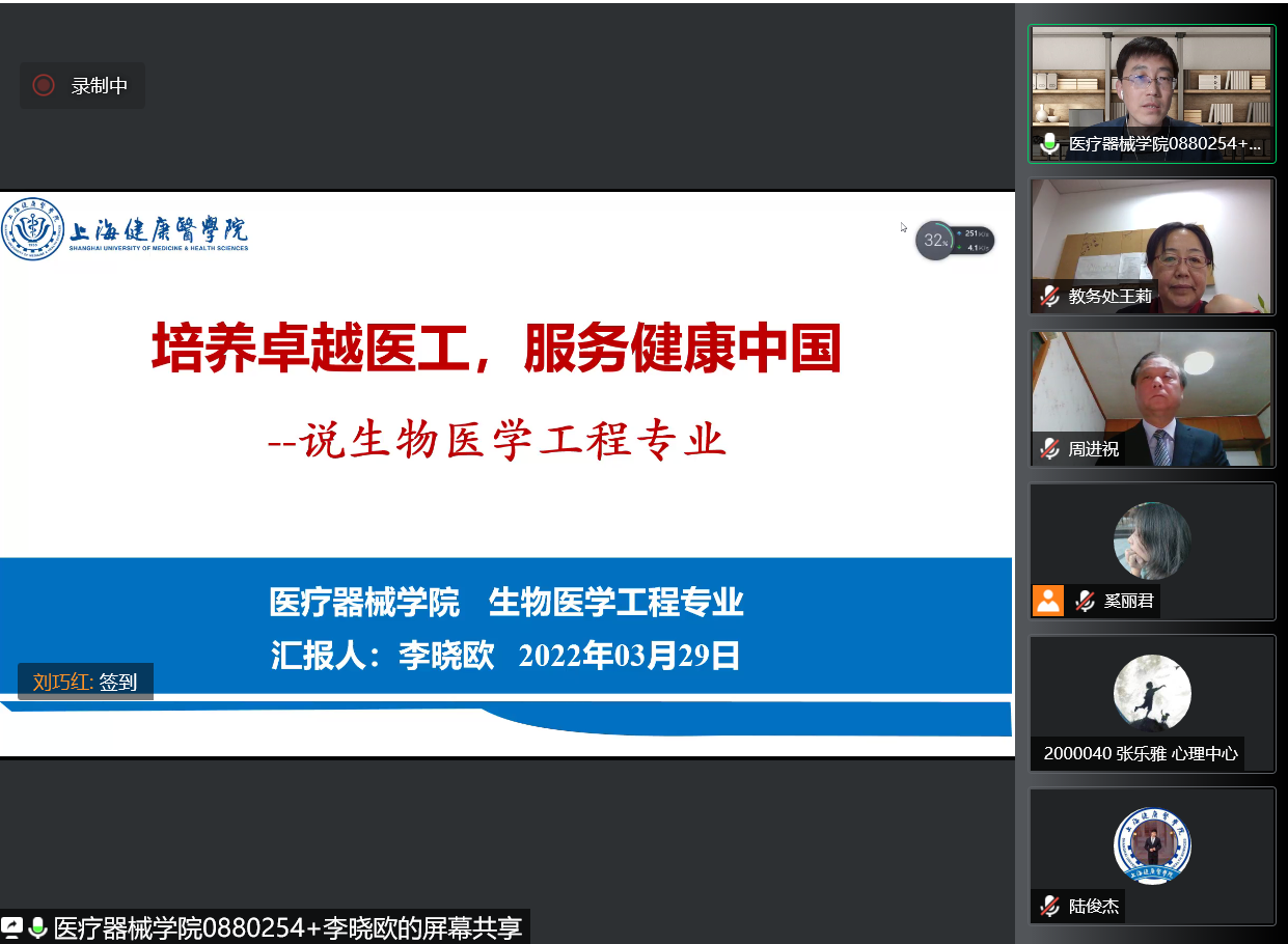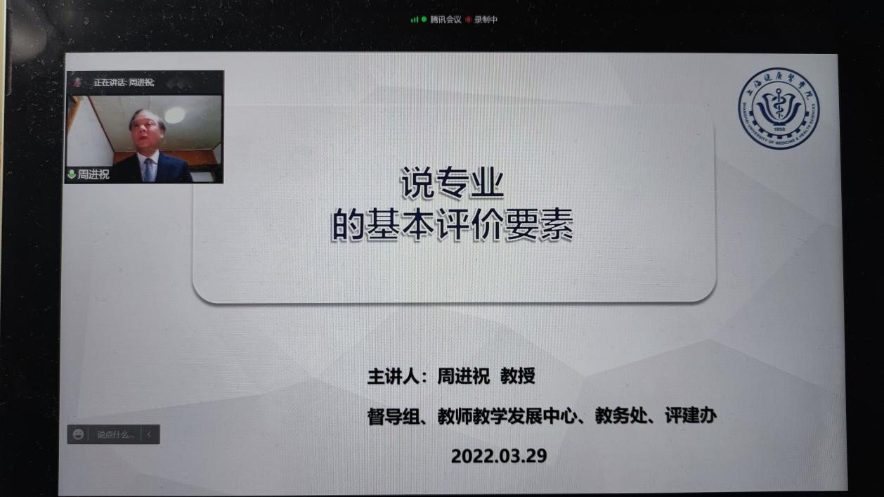 会上,医疗器械学院党总支书记、副院长李晓欧教授以生物医学工程专业发展为选题,以“培养卓越医工,服务健康中国”为主题,从专业定位、办学条件、培养方案、建设成果以及对未来思考等六个方面进行交流与展示。随后,校级教学督导专家周进祝教授结合评估专家对本校的相关指导建议,对“说专业”的基本评价要点进一步提炼和讲解。培训过程中老师们积极留言表示受益良多,进一步明晰了“说专业”的要求和内涵。