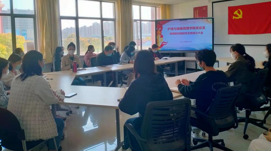 为充分发挥党支部的战斗堡垒作用和党员先锋模范作用,响应习近平总书记“让党旗在防控疫情斗争第一线高高飘扬”的号召。在学院党总支书记郭戎静和党总支副书记、院长朱爱勇的亲自部署下,经学院党总支研究并报上级党组织批准,于2022年4月3日下午,护理与健康管理学院党总支成立疫情防控临时党支部。学院领导班子、党总支委员和在校师生党员以线上线下的形式共同参加本次大会。