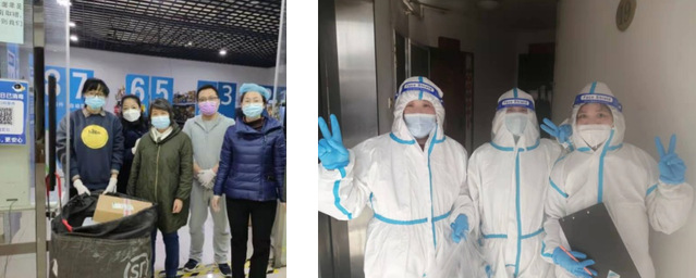 封校期间,学生快递滞留在绿地菜鸟驿站无法取出。为此,学校招募志愿者老师,帮助学生解决取件难的问题。正在家中备课的方文娟老师看到招募令后积极报名参加,她说“只想用自己的一点绵薄之力为大家做一些微不足道的事情。”小区封控期间,各位老师积极报名社区志愿者,用自己的专业知识发光发热。杨丽君老师连续多日服务,协助核酸检测、发放抗原自测试剂盒、指导操作、查看结果等;聂志妍老师辅助来自南京的支援队伍核酸检测采样,现场组织安排等;莫非老师、王翠平老师家中两个孩子,却也活跃在社区志愿的岗位上。作为民盟成员的教研室两位老师积极参与捐款活动,为一线抗疫工作者献出自己的一片心意(图4)。