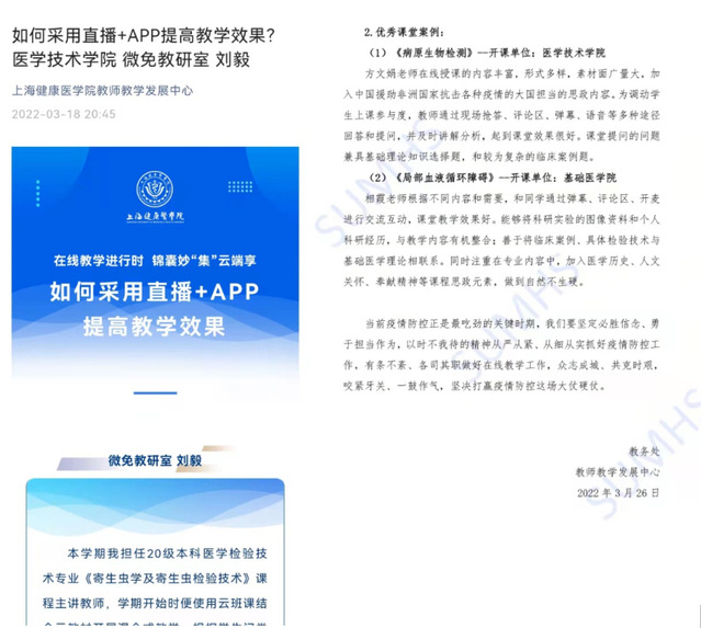 微免教研室本学期共承担4门课程、12个班级的授课任务。有前期丰富的教学资源作为支持,在线教学开展顺利。我们教师在线教学过程中注重以学生为中心,丰富授课形式,充分互动,能直播不录播,与学生共建优秀课堂,确保良好的教学效果。在全校范围内开展的“线上教学经验分享”典型案例征集活动中,教研室刘毅老师“如何采用直播+APP提高教学效果”获得认可并全校共享。在学校“在线教学第2周周报”中校级督导对在线授课评价给出了反馈和建议,教研室方文娟老师作为优秀课堂案例获得好评,尤其是在课程思政方面能够和课程内容有机融合,课堂活动多样,老师热情投入。3月28日,教育部举行国家智慧教育平台启动仪式,教研室自建在线课程《医学微生物学》入选“国家高等教育智慧教育”平台。疫情以来,此课程不仅为本校内师生提供了精炼的线上资源,同时共享到国家级平台、服务全国。