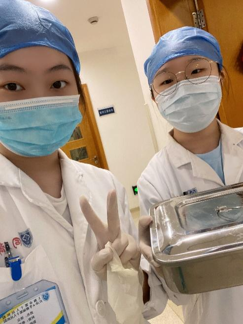 袁鑫怡(图4):最近的工作内容就是在门诊窗口为病人抽血。佩戴N95口罩是真的好闷,带着帽子和面屏的时候给抽血增加了很多难度。但是想到忙于核酸检测的老师还需要在此基础上穿上大白服装,真的感受到自己专业在疫情期间的重要性。向那些在抗疫一线战斗的医务工作者致敬,同时也希望自己以后可以成为一名合格的检验人。