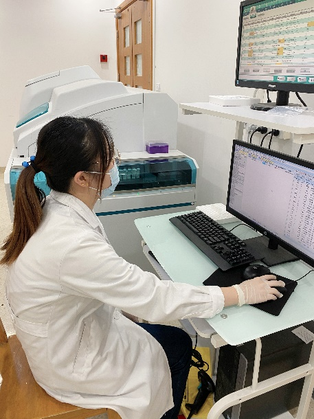 王懿菲(图2):近期我在分子和免疫组工作。在分子组期间由于老师们都在忙着核酸检测,我主要负责淋巴细胞亚群的检测。首先对样本进行编号和分类,其次在老师加完样之后完成洗涤、加试剂和上机等步骤。在免疫组期间,我的任务是完成过敏源的检测和CRP的检测。自从疫情进入高发期以来,检验科的老师们都承受着巨大压力,经常加班。我作为检验科的实习生,能够用我的绵薄之力分担老师们一些压力,也学习到了检验人的精神,同时更加坚定了我成为检验人的目标。