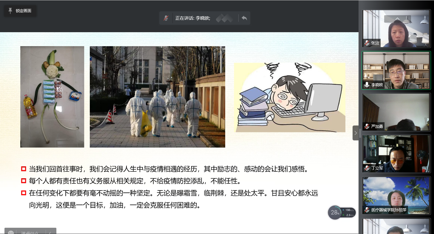 4月5日上午,医疗器械学院党总支通过腾讯会议平台召开中心组(扩大)学习会议,学院党总支委员、各党支部书记及委员、团总支书记、教研室主任、科级干部、工会主席等参加了会议,学院党总支书记李晓欧从“始终牢记初心使命”、“坚持发扬党的优良传统和作风”、“不断提升特殊时期的工作本领和能力”三个方面讲专题党课《在战“疫”中展现医械人的本色》。