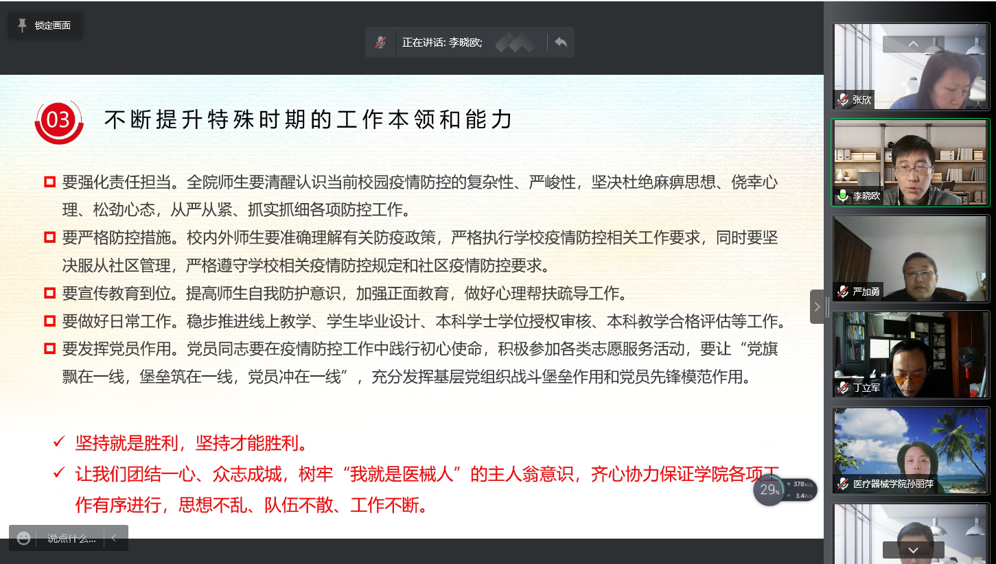 在“不断提升特殊时期的工作本领和能力”部分,李晓欧强调,突如其来的疫情,考验的不仅是党员干部的初心和使命、作风和意志,更是本领和能力,要求全体党员“要强化责任担当,清醒认识当前校园疫情防控的复杂性、严峻性,坚决杜绝麻痹思想、侥幸心理、松劲心态,从严从紧、抓实抓细各项防控工作”、“要严格防控措施,准确理解有关防疫政策,严格执行学校疫情防控相关工作要求,同时要坚决服从社区管理,严格遵守学校相关疫情防控规定和社区疫情防控要求”、“要宣传教育到位,提高师生自我防护意识,加强正面教育,做好心理帮扶疏导工作”、“要做好日常工作,稳步推进线上教学、学生毕业设计、本科学士学位授权审核、本科教学合格评估等工作”、“要发挥党员作用,党员同志要在疫情防控工作中践行初心使命,积极参加各类志愿服务活动,要让‘党旗飘在一线,堡垒筑在一线,党员冲在一线’,充分发挥基层党组织战斗堡垒作用和党员先锋模范作用”,树牢“我就是医械人”的主人翁意识,齐心协力保证学院各项工作有序进行,思想不乱、队伍不散、工作不断。