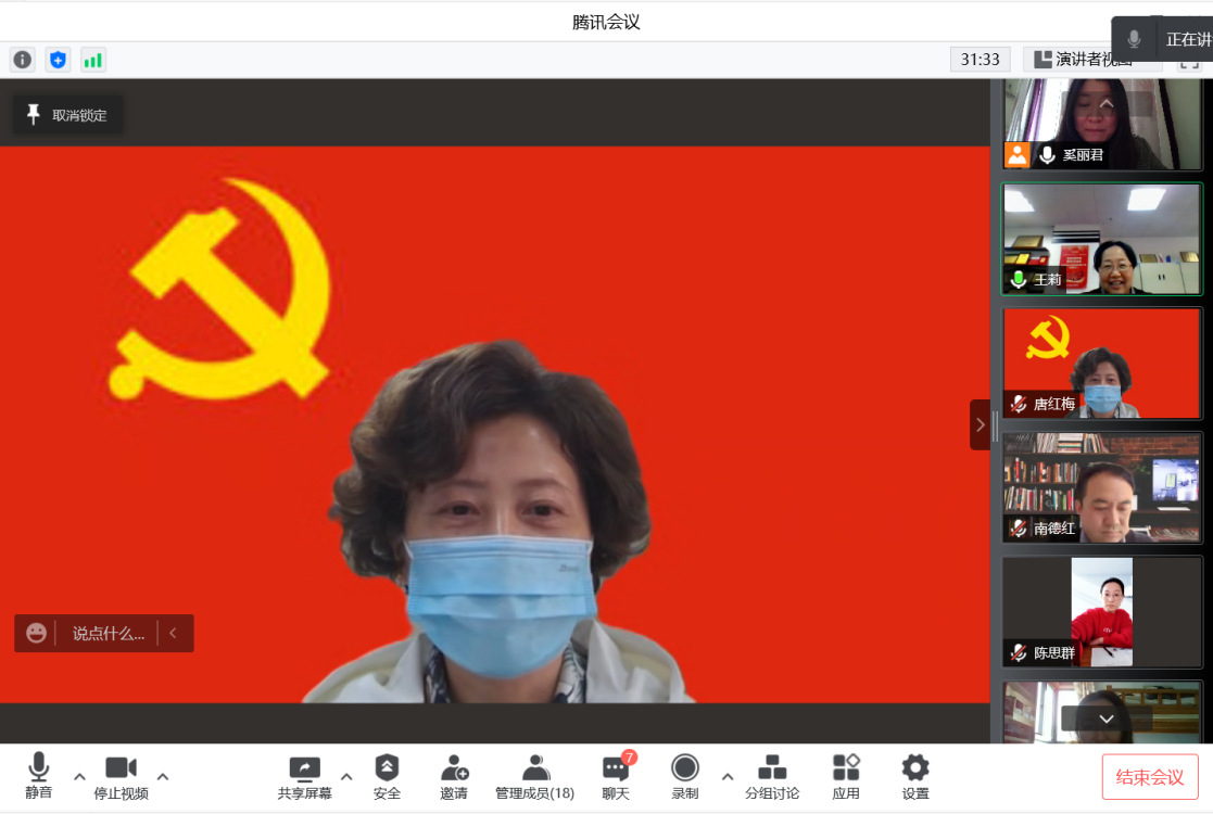 最后,校党委副书记、副校长唐红梅在总结中指出,面临疫情大考,党员首先要保持头脑清醒,坚定理想信念,做到不信谣、不传谣,同时也要主动亮出党员身份,做弘扬正能量的宣传者和防控科普的传播者。其次要保持身体健康,她详细介绍了各种消毒步骤和要点,嘱咐在社区做志愿者和居家隔离的老师做好科学防护。要坚持党建促业务,充分发挥先锋模范作用,围绕中心抓党建、抓好党建促中心,做到一名党员就是一面旗帜。