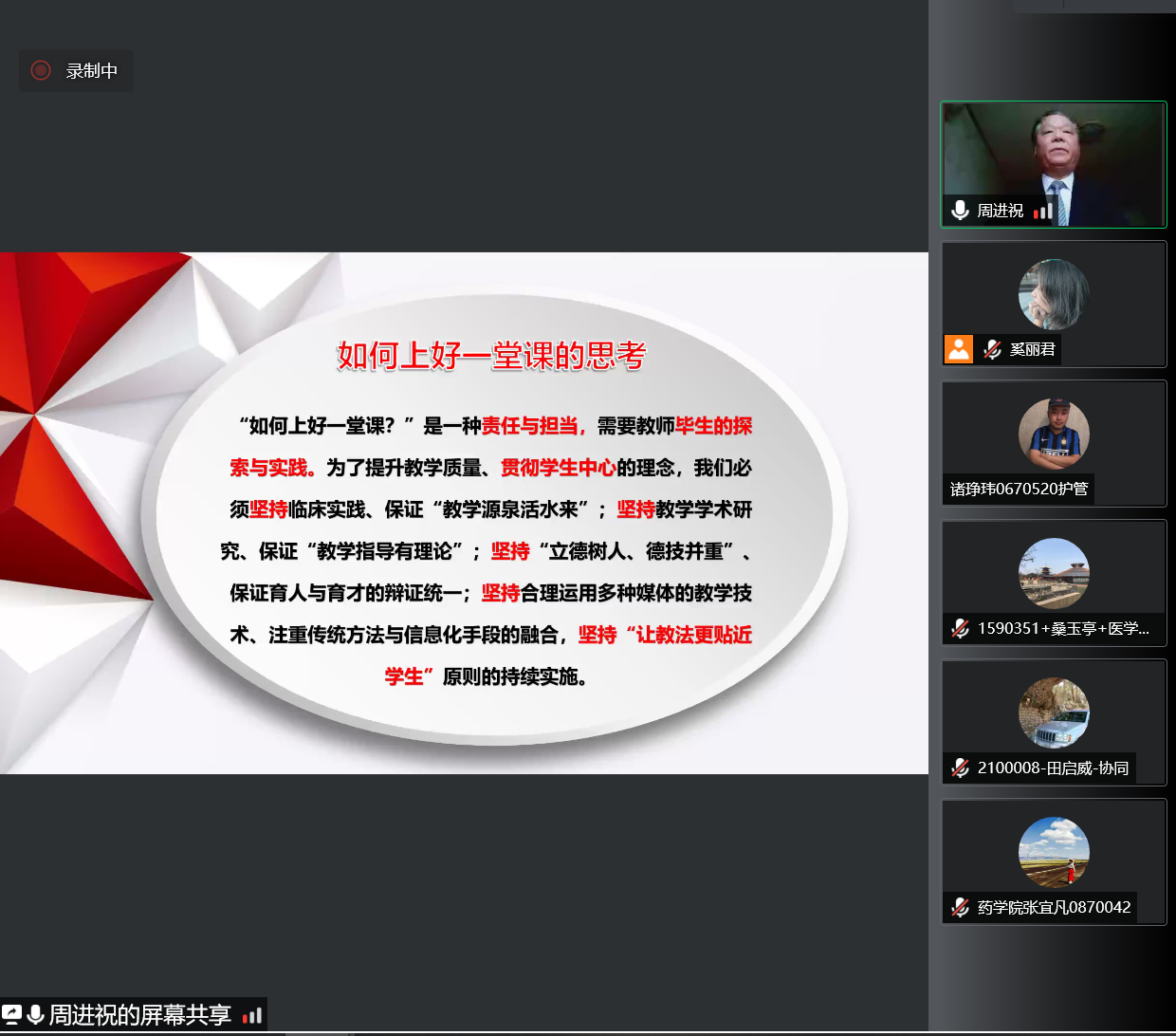 培训会上,基础医学院吕叶辉老师邀请10名学生共同演示了《人体的构造I- 肝》线上教学示范课。吕老师以人体肝脏功能为导入,从病例、病理举例分析、逐步引导学生进入课程的主题,获得了与会教师的一致好评。随后,校级教学督导专家周进祝教授在肯定和总结吕老师授课的基础上,与参会教师就“如何上好一堂课”开展研讨与分享。他从教学思考角度、课前准备、教学课堂和课后拓展等方面进行深度探讨与解析。