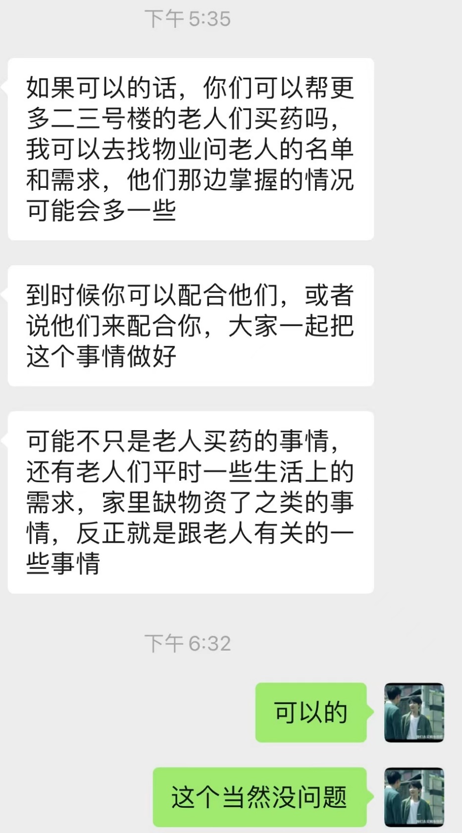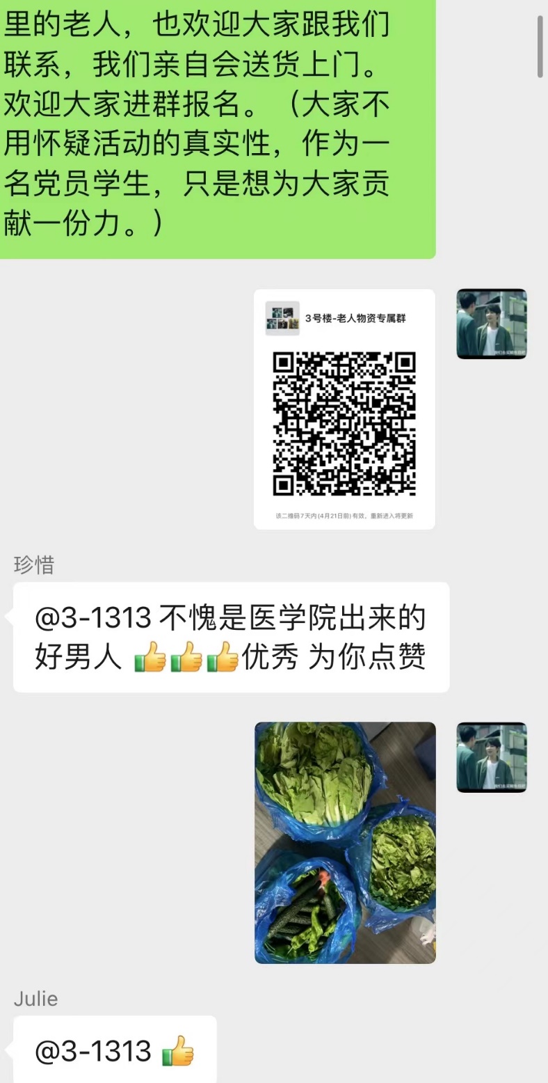 “谢谢你们年轻人细心关爱老人,传承了中华民族优良美德,再次感谢”“帮助弱者,大爱无疆,为你点赞”“母亲的药收到了,非常感谢”“对你们这种抗疫时期的精神举动感动……”“我妈702也收到物资了,谢谢”“不愧是医学院出来的好男人,优秀,为你点赞”“代表商管和物业感谢你们”……看着微信里弹出来的一条条信息,潘凯凯脸上露出开心的笑容。